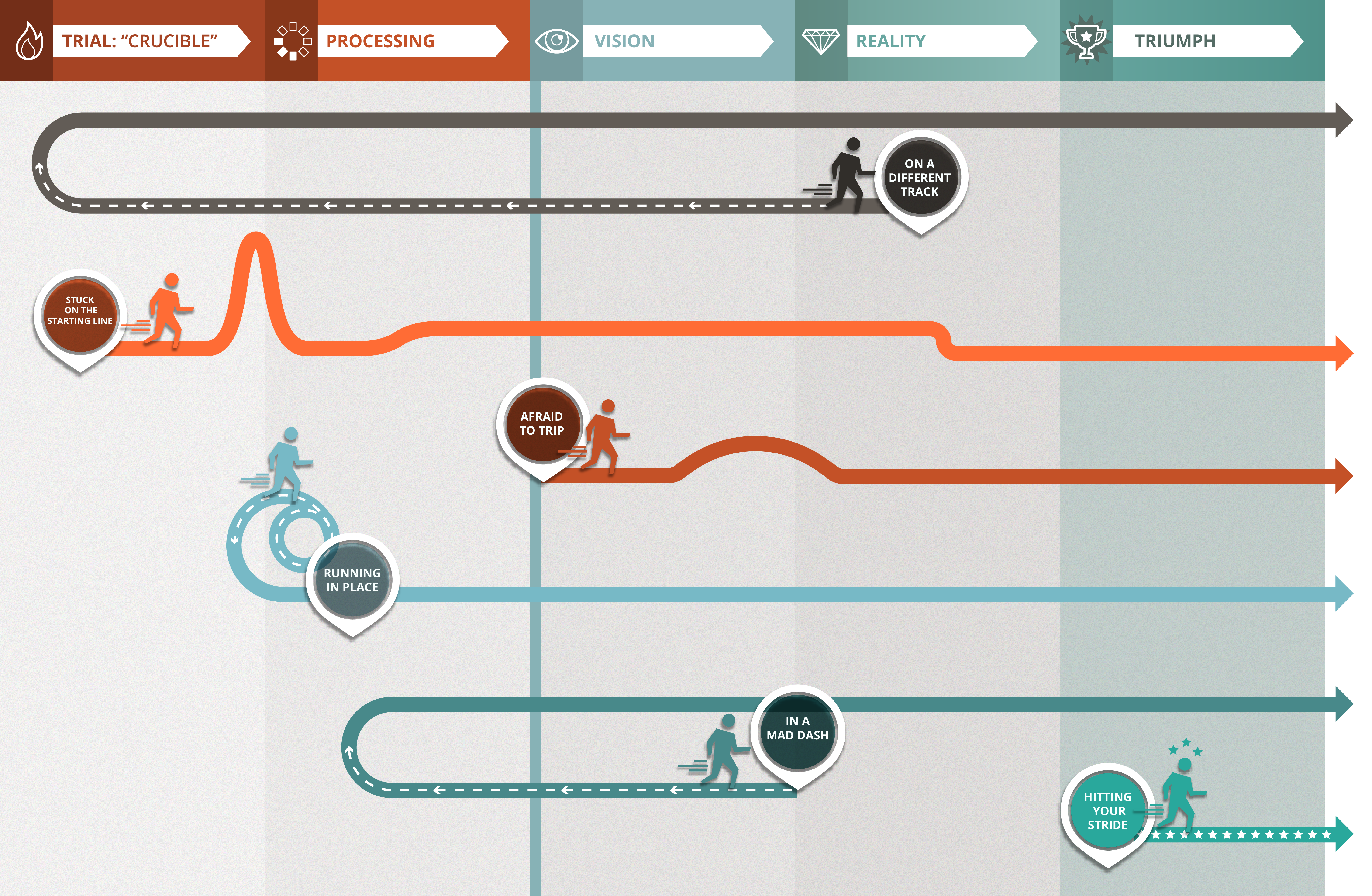 Running in Place: This Runner in Place has accepted their crucible as part of their life and are not really angry about it or hurt by it anymore, but they haven’t hit the “restart” button yet. They have no real vision for their life; they’re just going through the motions and surviving. They need help to take small steps toward finding a new vision — one not defined by what happened in the past that they can get really excited about.